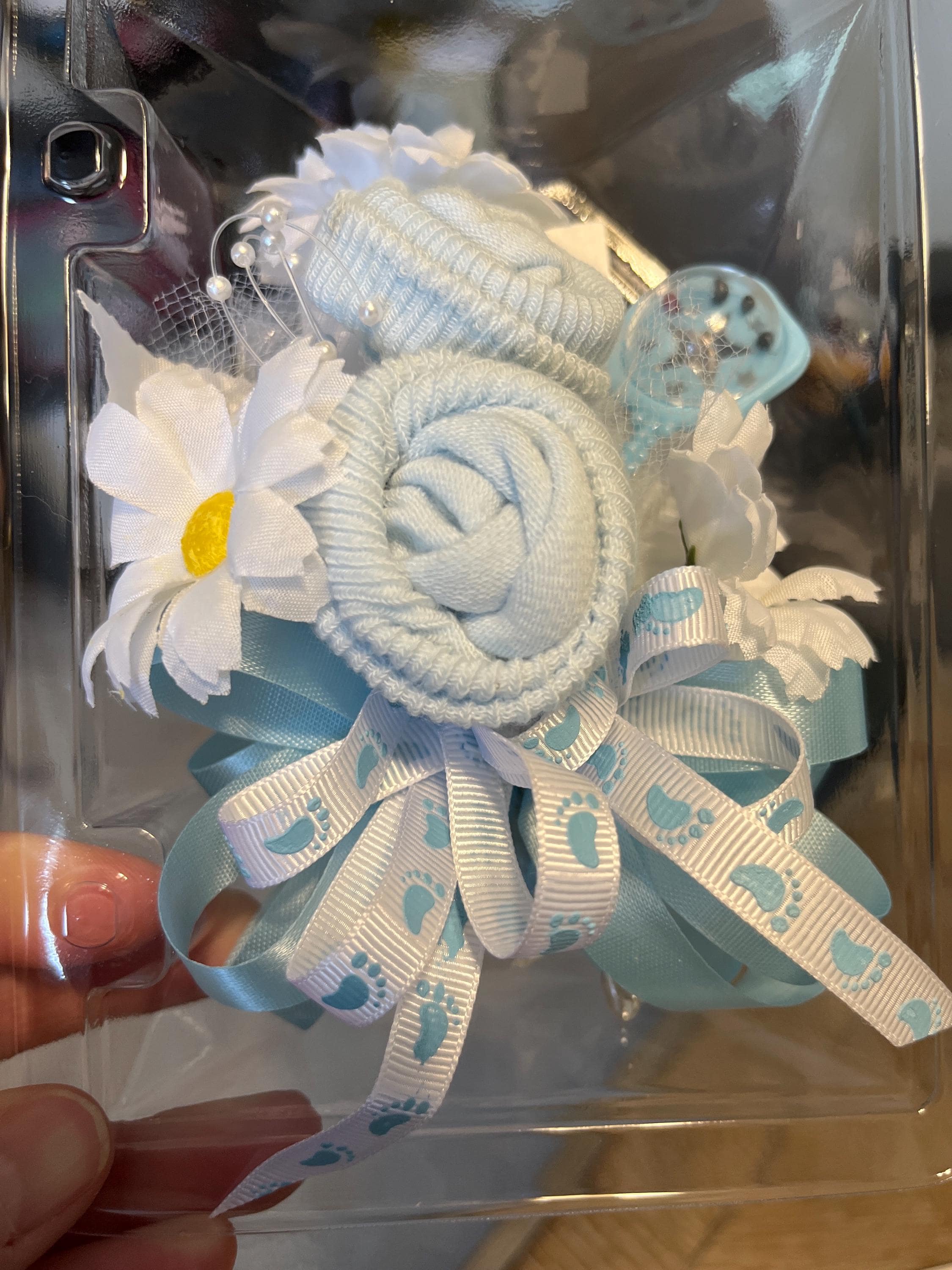 Cute little corsage and very well made! I ordered another in a different color. I would recommend this vendor for your specialty baby shower needs.