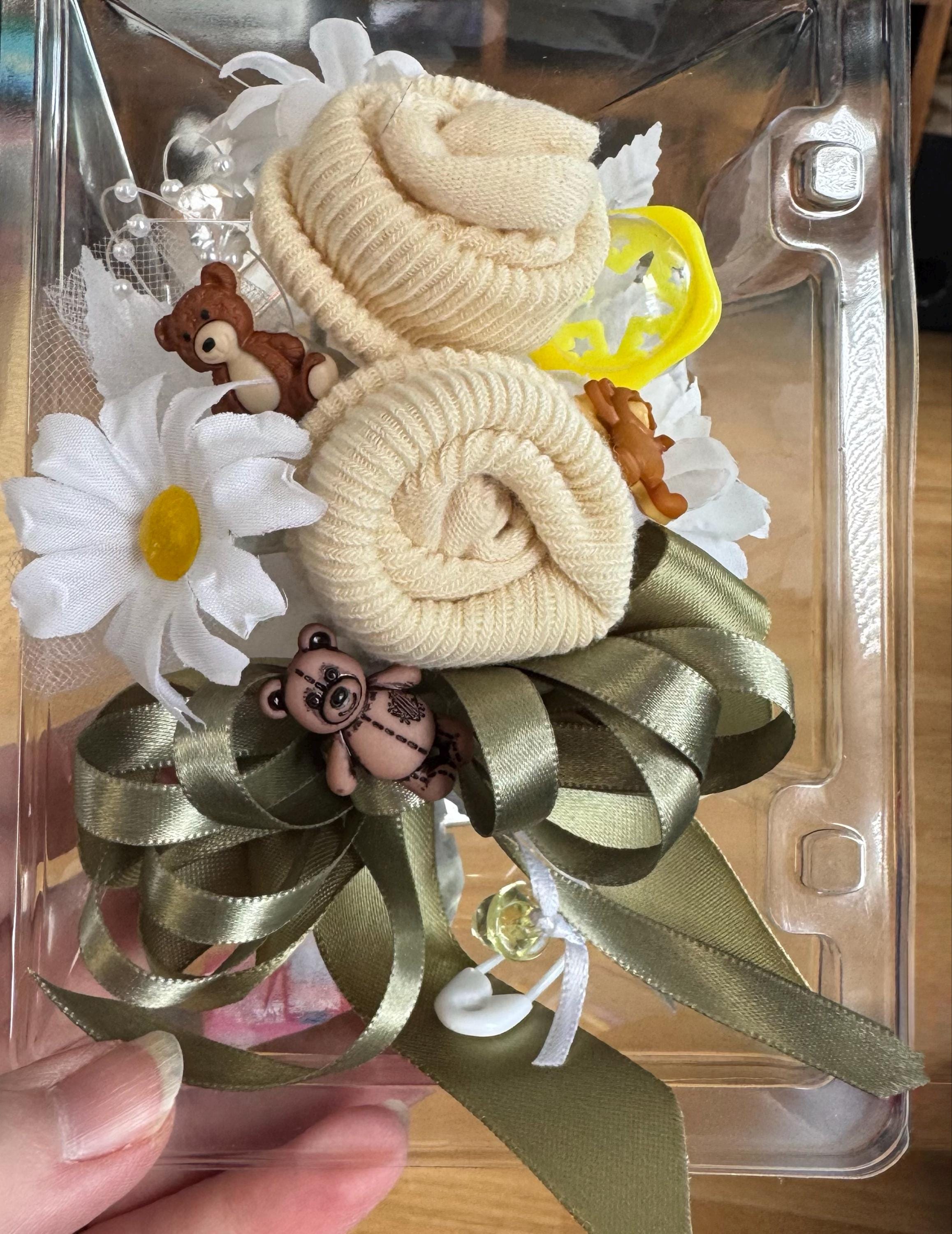 Baby shower corsages handcrafted the match your color choices. Each corsage is made using a pair of infant socks, flowers, miniature baby rattle, net, pearls, pink or blue dipper pins or miniature pacifier and ribbon.