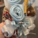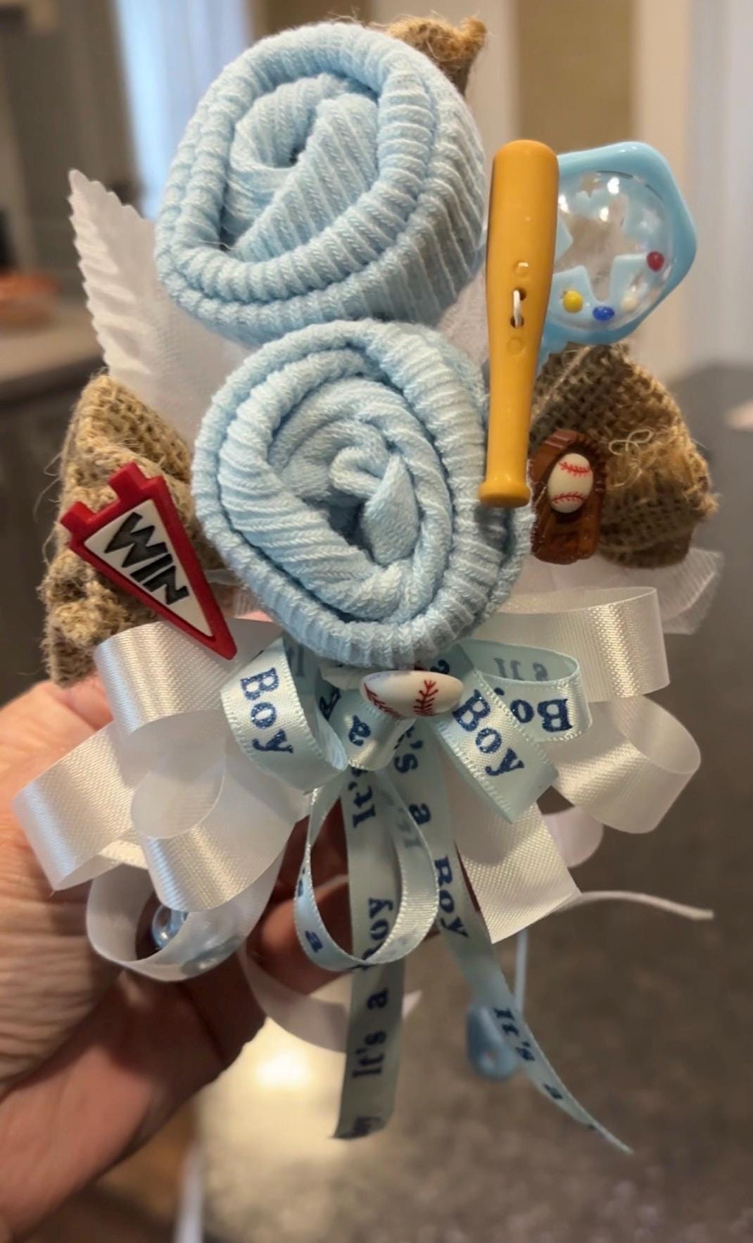 Baby shower corsages handcrafted the match your color choices. Each corsage is made using a pair of infant socks, flowers, miniature baby rattle, net, pearls, pink or blue dipper pins or miniature pacifier and ribbon.